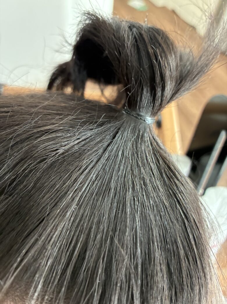 しっかり髪を集めてゴムで結っておきましょう。
