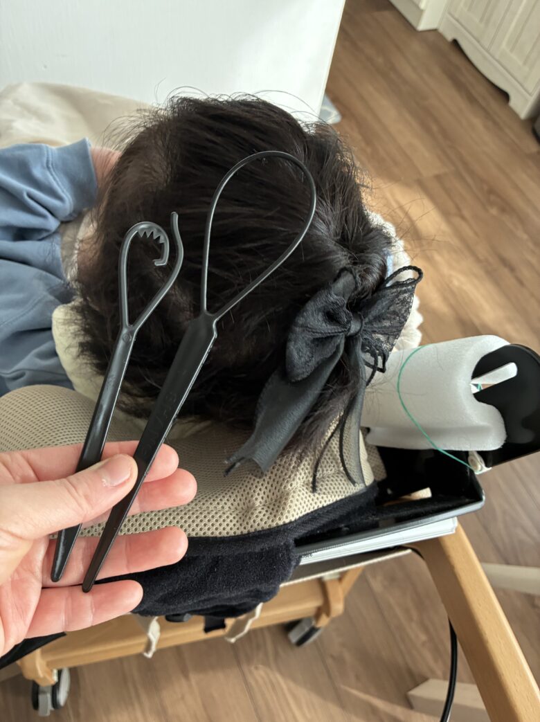 福祉美容師が紹介する飾り付きヘアゴムの結び方です。