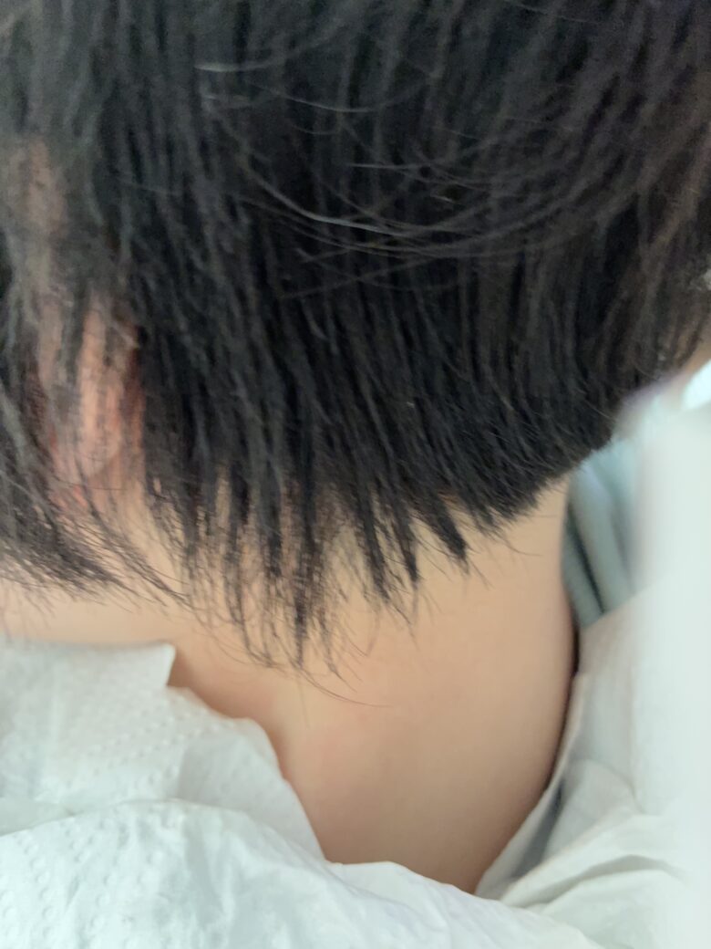 襟足からパラパラと髪の毛が出てきます。この部分のみをチョンっとカットします。