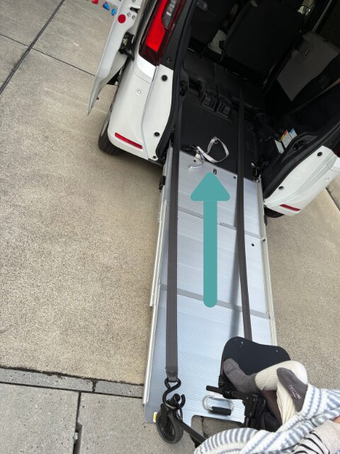 車いすを降ろすときは、乗せるときの逆でリモコンを【出】を押しながら、私自身もバックで車いす(バギー)を支えて出てきます。