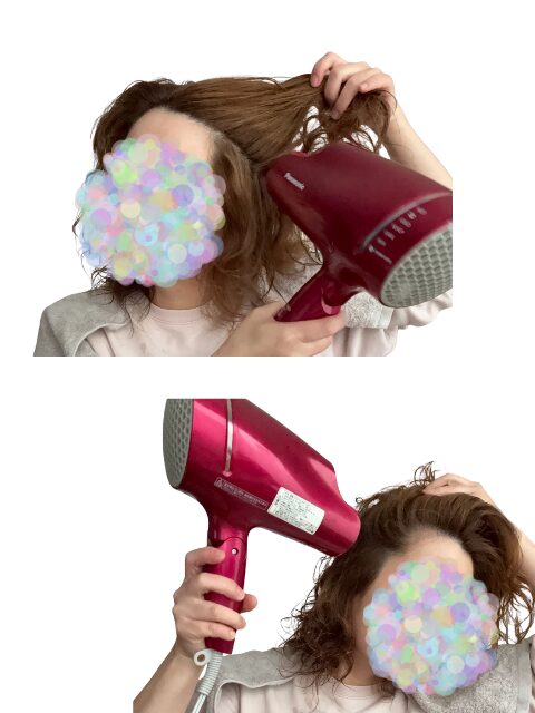 濡れている毛先まで乾かしてしまうと、ウエーブが伸びてしまうので根元のみを乾かすようにドライヤーをあてていきましょう。